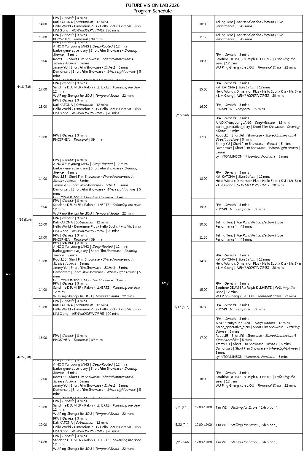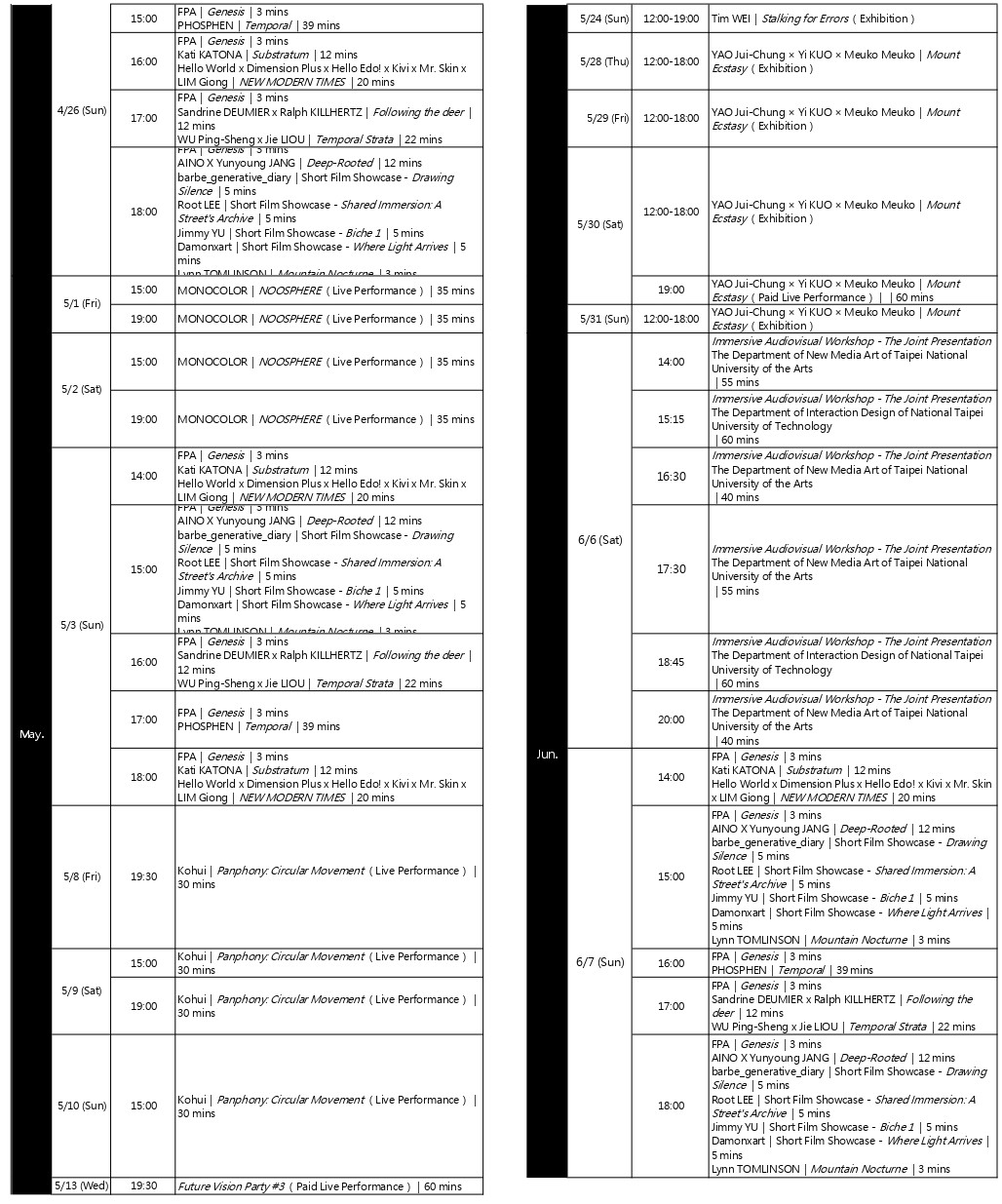 AINO X Yunyoung JANG, barbe_generative_diary, Damonxart, Sandrine DEUMIER, Dimension Plus, Floating Point Art, Hello Edo!, Hello World, Ralph KILLHERTZ, Root LEE, LIU Tung-Yu, Jie LIOU, Kati KATONA, Kivi, Kohui, Yi KUO, LIM Giong, Meuko Meuko, MONOCOLOR, Mr. Skin, PHOSPHEN, Telling Tent, Lynn TOMLINSON, Warrick TSAI, Tim WEI, WU Ping-Sheng, YAO Jui-Chung, Jimmy YU