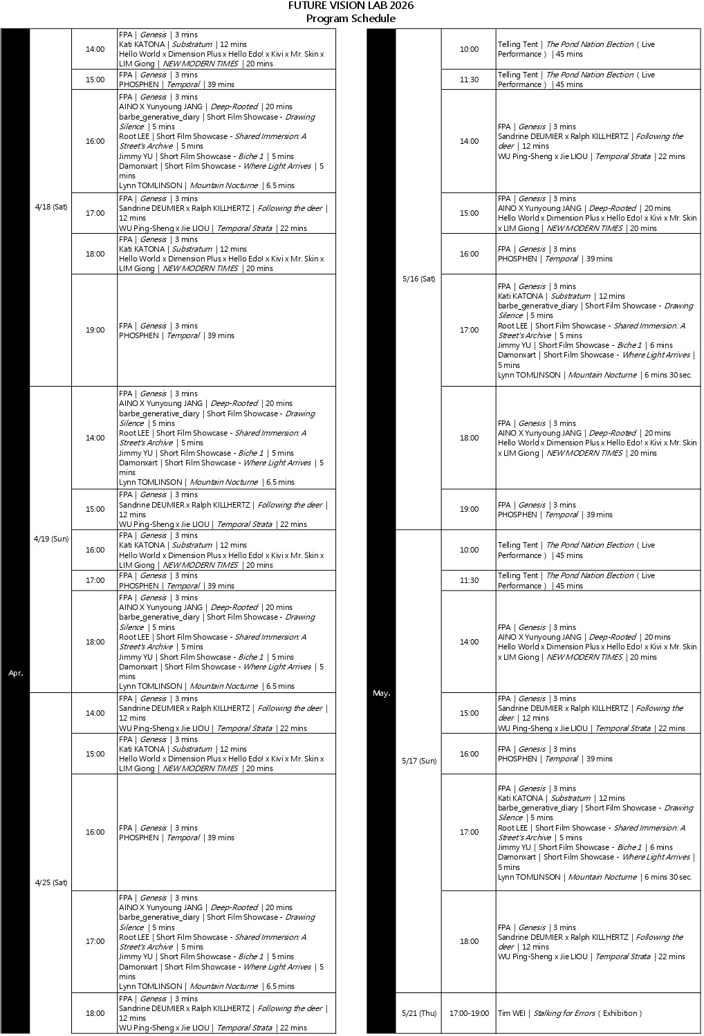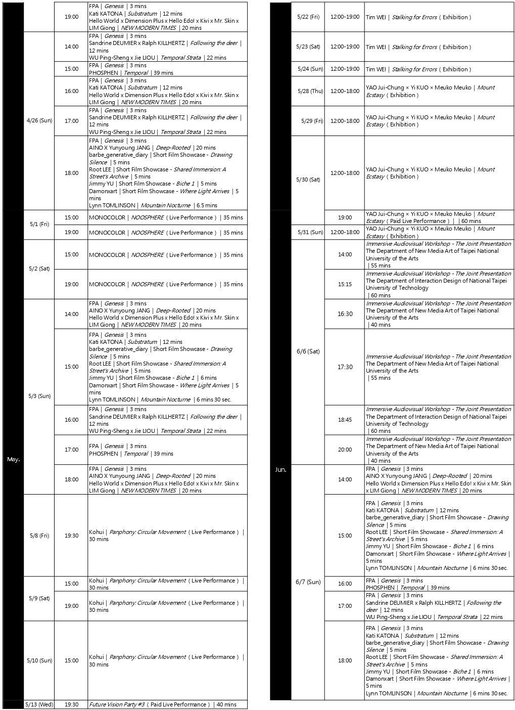 AINO X Yunyoung JANG, barbe_generative_diary, Damonxart, Sandrine DEUMIER, Dimension Plus, Floating Point Art, Hello Edo!, Hello World, Ralph KILLHERTZ, Root LEE, LIU Tung-Yu, Jie LIOU, Kati KATONA, Kivi, Kohui, Yi KUO, LIM Giong, Meuko Meuko, MONOCOLOR, Mr. Skin, PHOSPHEN, Telling Tent, Lynn TOMLINSON, Warrick TSAI, Tim WEI, WU Ping-Sheng, YAO Jui-Chung, Yude LIN, Jimmy YU